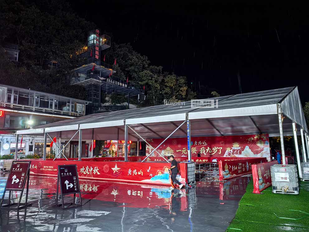 三门峡篷房出租克服山路难行、物料进场不易等多重挑战,成功在老君山搭建起白色人字形篷房,即便国庆期间阴雨连绵,仍为1元午餐区筑牢了坚实保障,让数万游客在山间感受到温暖与便捷。