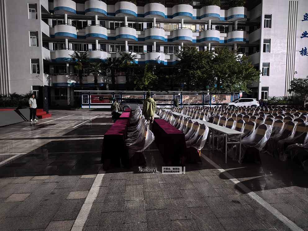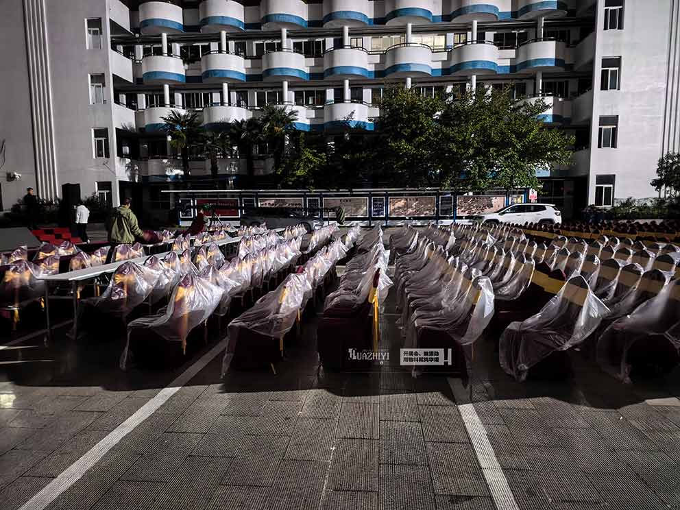 布场安排在校庆开始前一天,天气预报显示会下雨,开封桌椅租赁提前制定了周全的防雨预案。在桌椅组装排列完成后,团队迅速为每一把贵宾椅套上定制的透明防雨保护套,保护套完全覆盖椅身。布场过程中,团队成员分工明确,冒雨高效作业,从桌椅搬运、组装到防雨保护,每一个环节都有条不紊,确保在深夜雨势增大前完成全部布场工作,用专业与担当应对天气挑战。