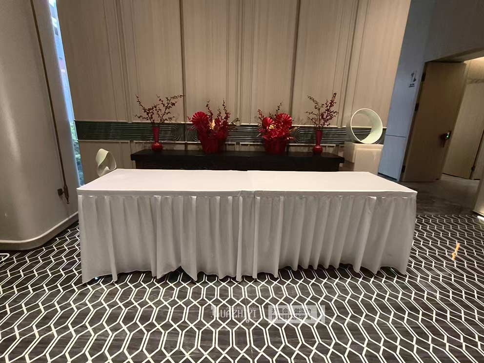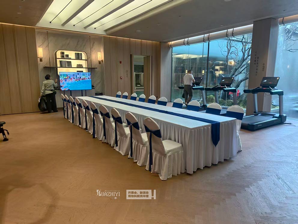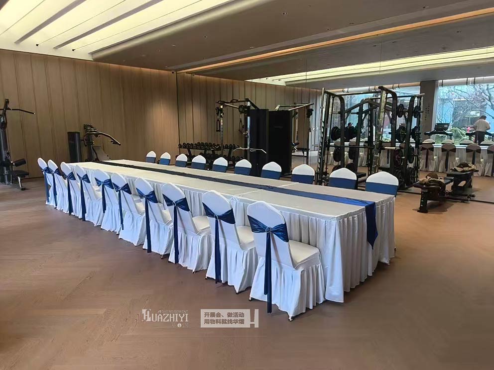 商丘桌椅沙发租赁深入把握中海峯境三號院的高端楼盘调性,精心规划布场细节。活动现场的核心接待与洽谈区域,整齐摆放着铺有白色桌布的长条桌,纯净的白色桌布平整垂顺,尽显简洁大气,与项目倡导的品质生活理念相得益彰。搭配的白色贵宾椅质感细腻,辅以蓝色腰围点缀,白蓝撞色既清新雅致又不失沉稳,让客户在休憩洽谈中倍感舒适与尊崇。