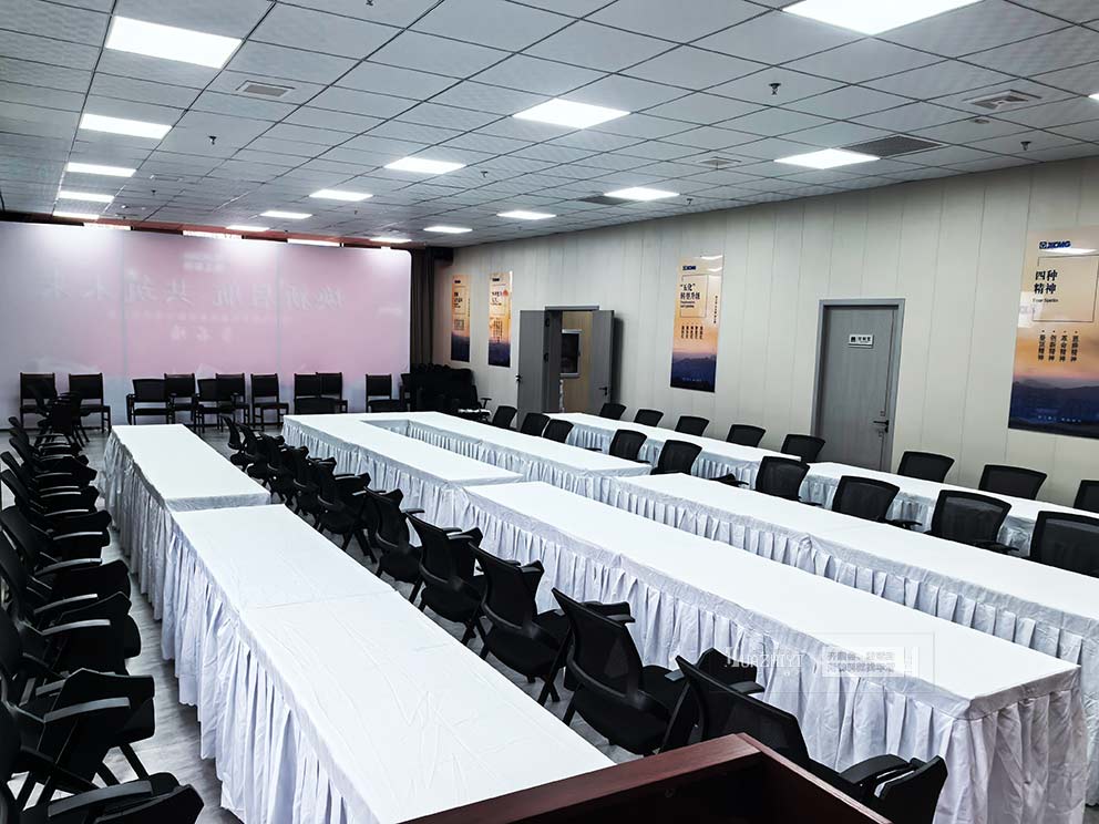 铺有白色桌布的长条桌,是商务场景的质感担当,完美适配交流会多元需求。选用抗皱耐磨的优质白色桌布,线条整洁利落,自带庄重专业的氛围,与徐工集团沉稳务实的企业气质高度契合,同时能有效遮盖桌体细节,让桌面保持整洁统一。长条桌按需布局于签到区、洽谈区与资料区,桌面预留充足空间放置参会资料、饮品与展示物料,桌布边缘规整下垂,既提升视觉美感,又能避免使用中出现滑动褶皱,兼顾实用性与观赏性。