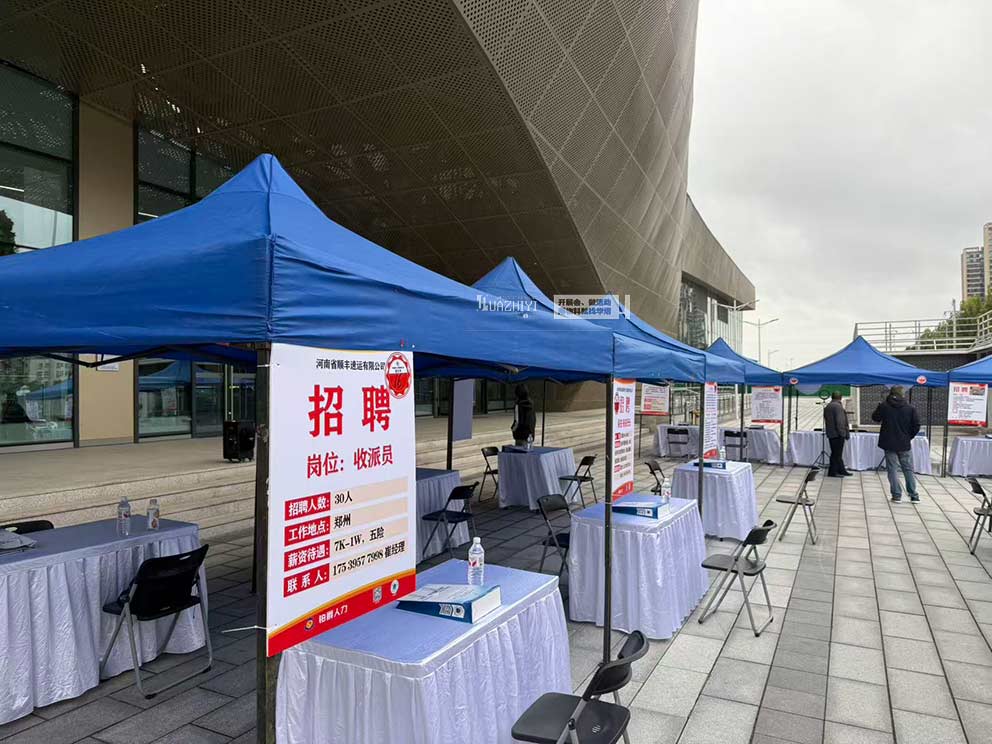 郑州帐篷桌椅租赁为招聘会搭建的蓝色折叠帐篷,成为每个企业的专属招聘“驿站”。帐篷采用轻量化铝合金支架与高密度蓝色牛津布顶篷,单顶尺寸为3米×3米,折叠式设计便于快速搭建与拆卸,完美适配招聘会的临时场地需求。四周无篷布的开放式结构,让招聘单元通透无遮挡。