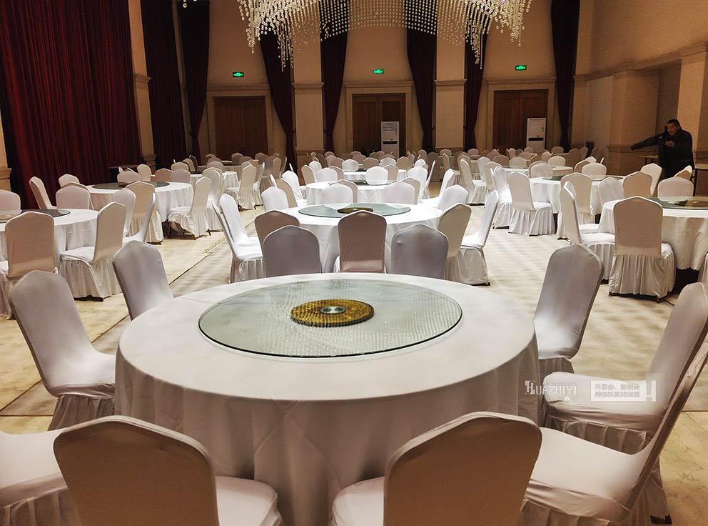 开封桌椅出租以带玻璃转盘的大圆桌与白色贵宾椅为核心布场物料,为产业园打造了兼具商务质感与舒适体验的活动空间,适配各类会议、接待与交流场景。