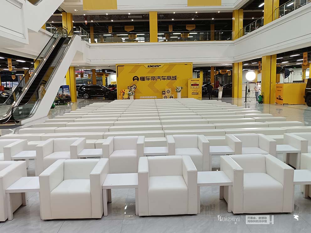 单人白色皮质沙发成为活动现场的亮点物料,简约大气、质感出众,白色皮质表面光滑易清洁、耐脏耐用,既彰显高端格调,又与汽车商场的现代简约风格完美融合。双人沙发条与三人沙发条则精准适配多人洽谈与休憩需求,布局灵活多样。两种沙发条与单人白色皮质沙发搭配摆放,划分出清晰的休憩区与洽谈区,让现场布局规范有序,动线流畅。